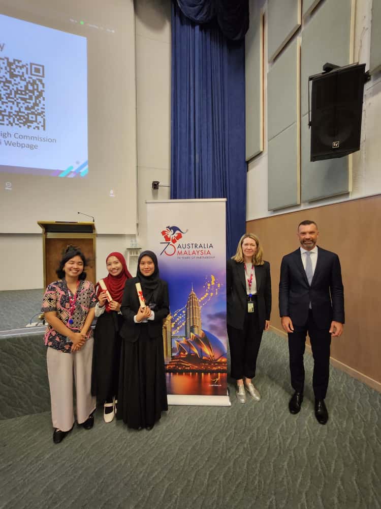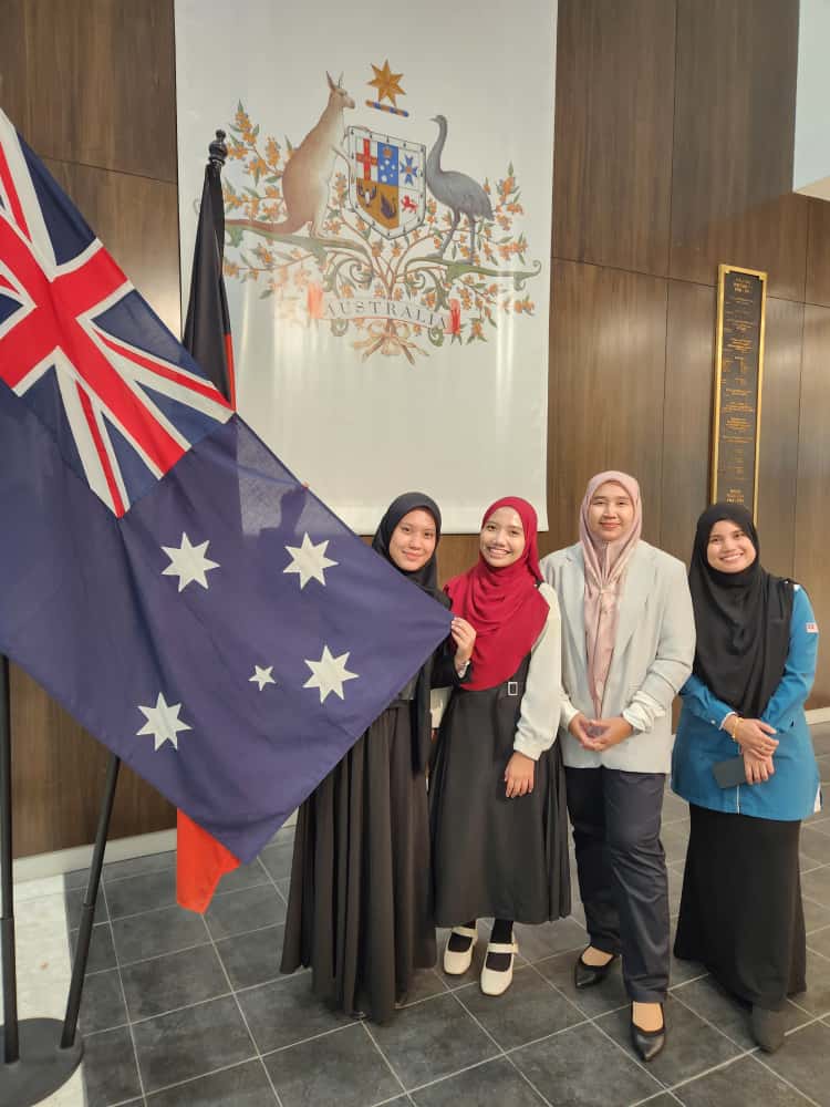 Nurul Ain Najwa Zulkifle (dalam Hijab Merah) dan Nur Afiqah Ismail (dalam Hijab Hitam) dengan Pesuruhjaya Tinggi Pesuruhjaya Tinggi Australia Simon dan Penasihat Pendidikan dan Penyelidikan di Suruhanjaya Tinggi Australia Malaysia, Sophie Hogan