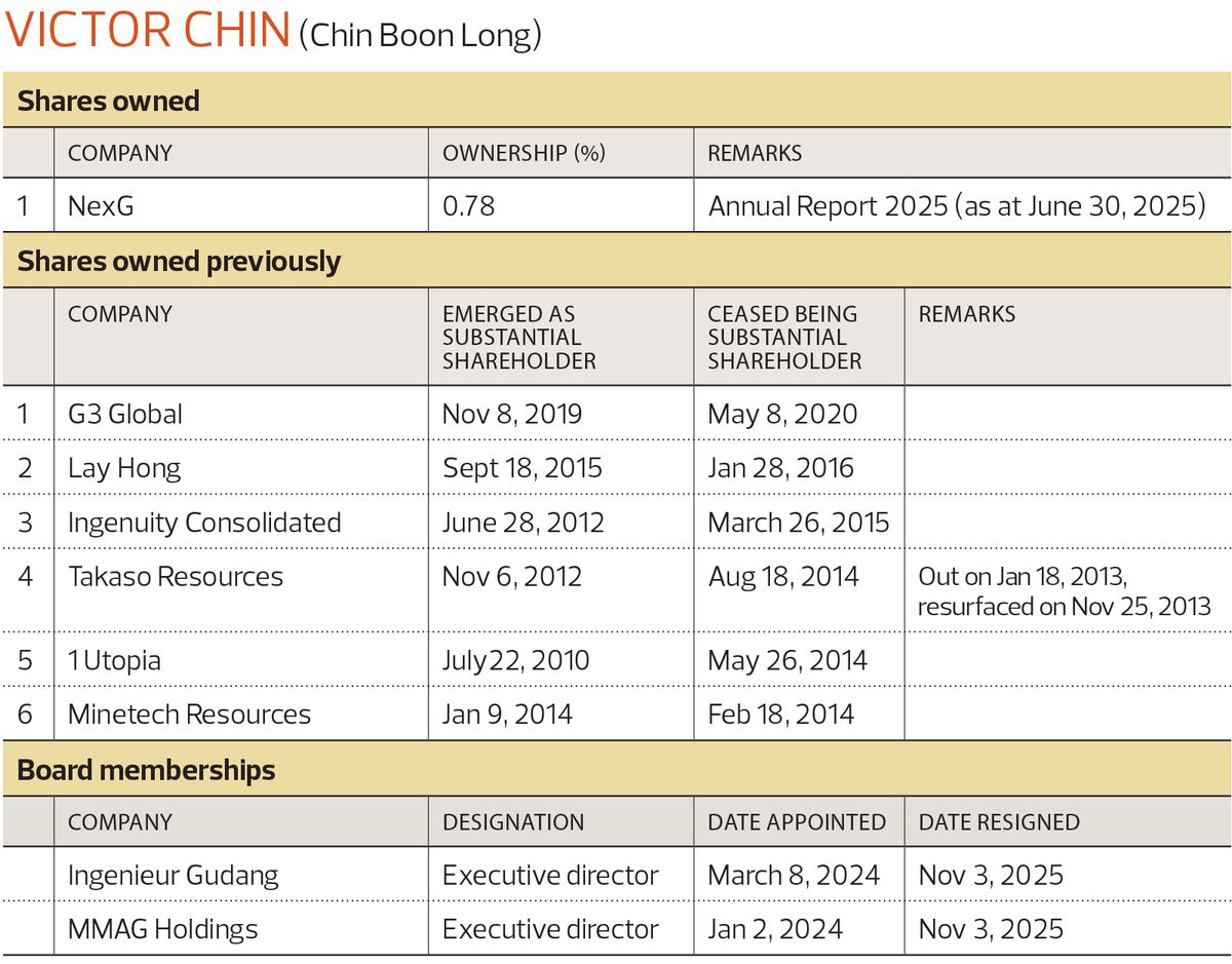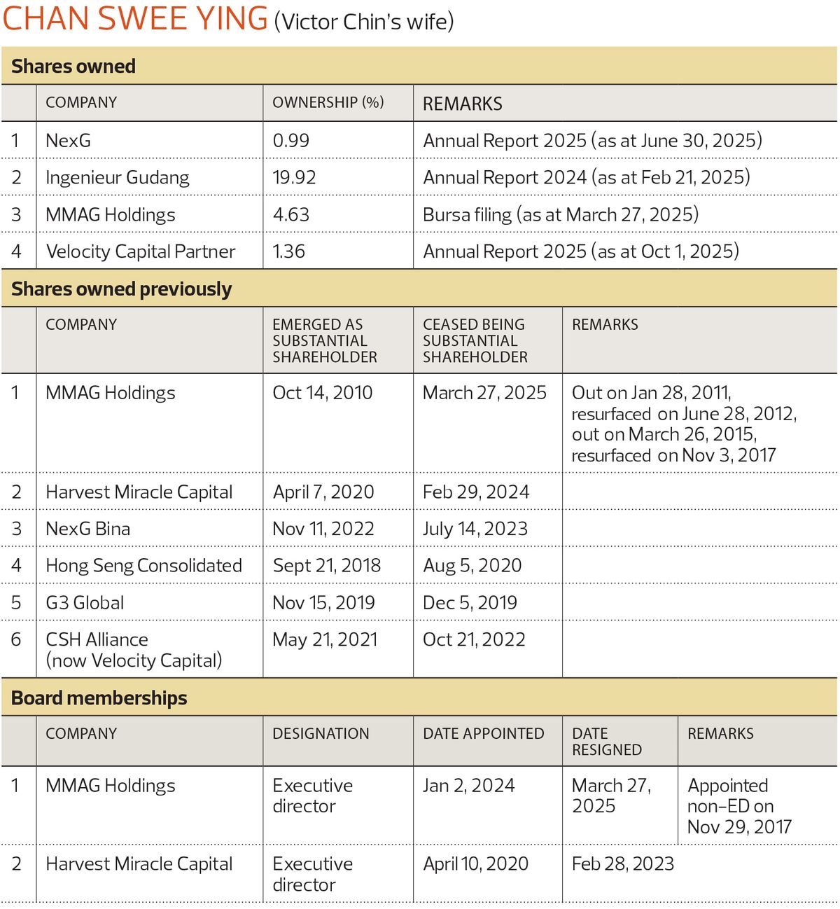 Semakan di Bursa Malaysia dan Bloomberg menunjukkan bahawa pada akhir Jun 2025, Chin memegang kepentingan langsung sebanyak 0.78% dalam NexG. Blok saham itu bernilai RM7.78 juta sekarang jika beliau masih memiliki saham tersebut.