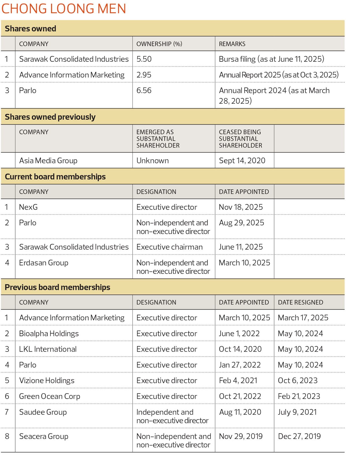 Chong menganggotai lembaga pengarah SCIB, Parlo dan NexG, serta Erdasan Group Bhd (KL:ERDASAN), firma automasi industri yang dikenali sebagai AT Systematization Bhd.