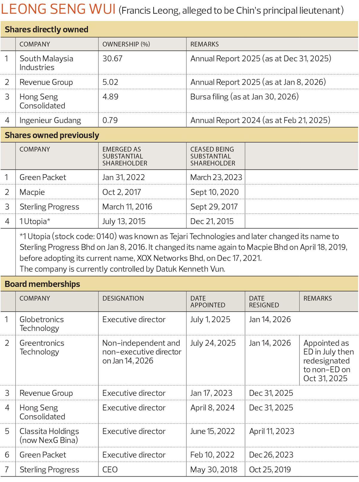 Sementara itu, orang kanan Chin, Leong mempunyai 30.67% pegangan dalam pengeluar wayar South Malaysia Industries Bhd (KL:SMI); 5.02% kepentingan dalam Kumpulan Hasil; 4.89% pegangan dalam Hong Seng; dan 0.79% pegangan dalam Ingenieur Gudang. Saham beliau dalam empat syarikat ini dianggarkan bernilai RM15.58 juta.